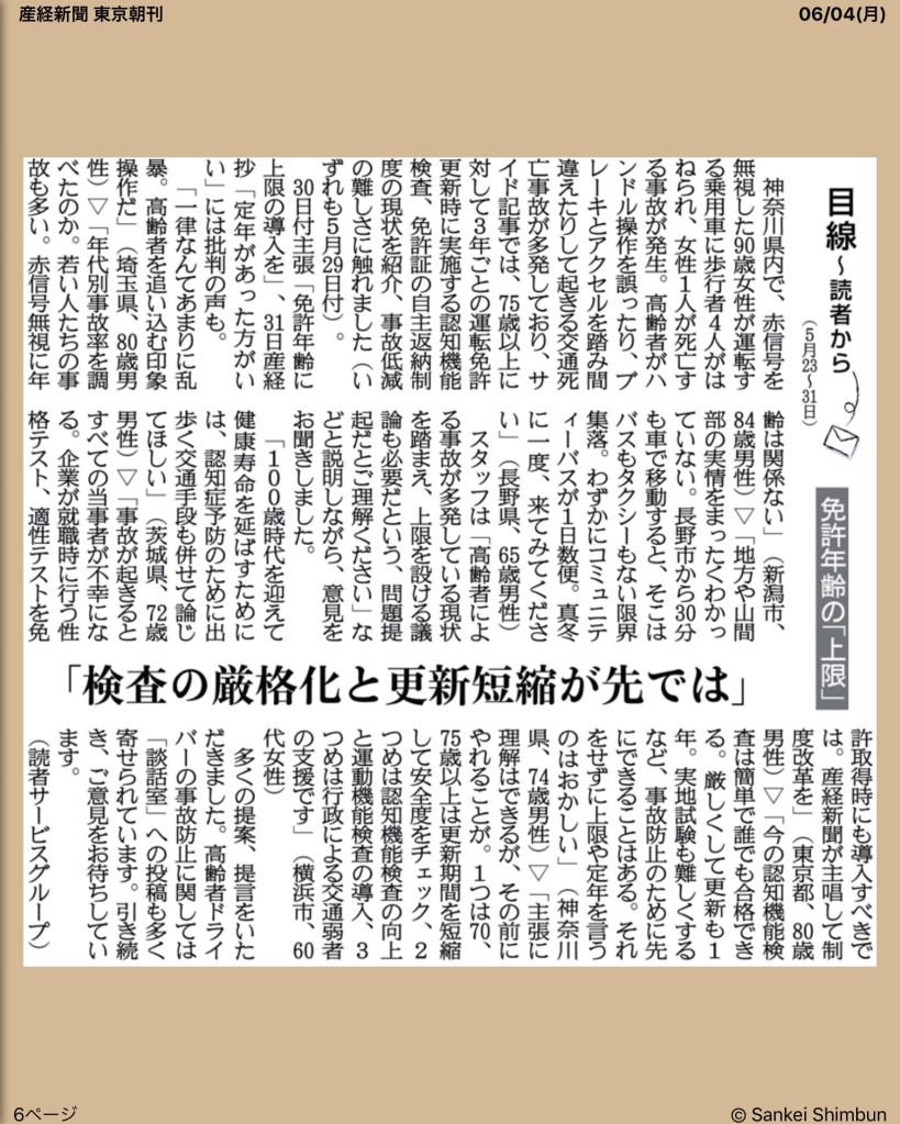僕は車の運転に年齢制限を設けるのは反対ですが、高齢運転事故はもはや深刻な社会問題になっており、高齢者の日常生活を支えるために公道が恐怖の戦場になるのは阻止しなければいけません。