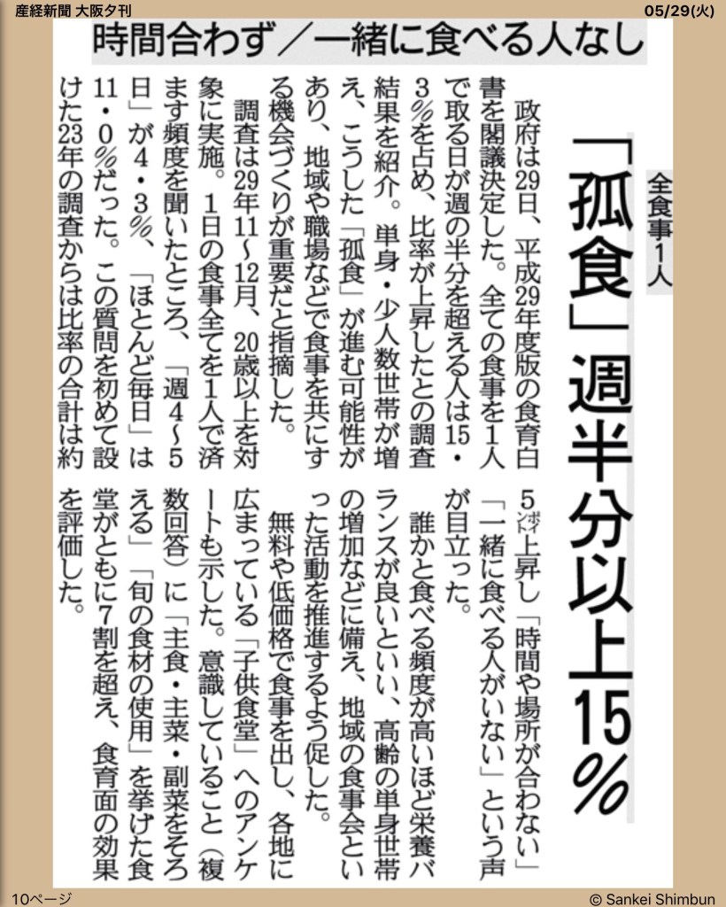 1週間の半分以上を1人で食事をする方が、高齢者に限らず、全世代で15%以上らしいです。