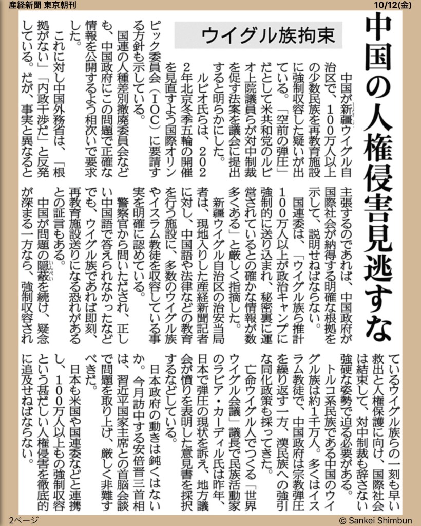 中国政府によるウイグル族の弾圧も、最近、日本ではあまり報道されなくなりました。2年前の新聞記事をアップします。何度読んでも衝撃を覚えます。