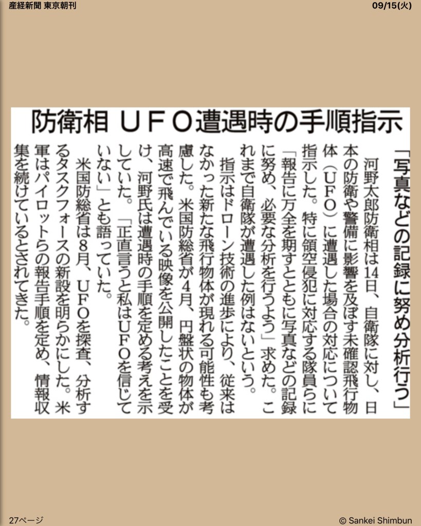 ちなみに、「UFO接近遭遇マニュアル」を自衛隊に指示した河野太郎防衛相は、UFOを信じていないようです。この、信じていないの対象は「UFO=異星人」と読み取れます。政治家が「異星人の存在を信じない」ことを宣言するのに、意味があるのでしょうか。うーん、わからん。