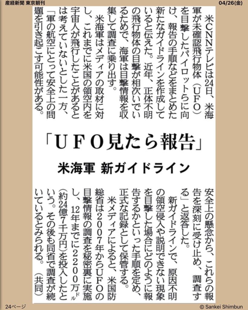 やはり、こういう時代になったんですね。もちろん、UFOは未確認飛行物体の略称なので、短絡的に、UFO=異星人ではなく、新型飛行機やドローンなど、情報や存在を確認できない飛行物体を含めた総称です。