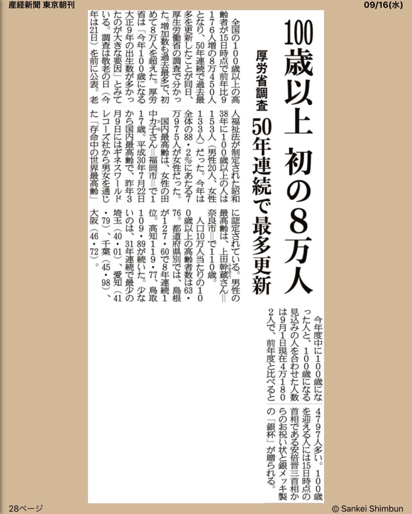 厚生労働省によると、日本全国の100歳以上高齢者人数が、今月15日の時点で8万450人に達し、50年連続で過去最高を更新したようです。なお、100歳以上高齢者の約88%が女性。国内最高齢も福岡市の女性で117歳。存命する世界最高齢となり、ギネスブックに登録されているようです。